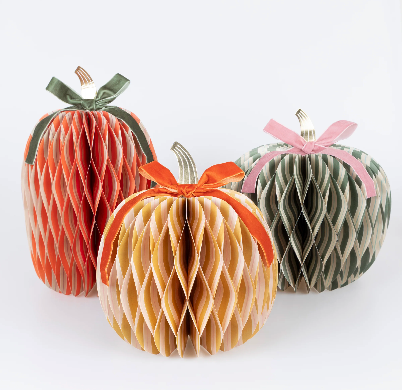 Add a cosy yet stylish touch to your Halloween, Fall and Thanksgiving decor with these striped honeycomb Paper Pumpkins.