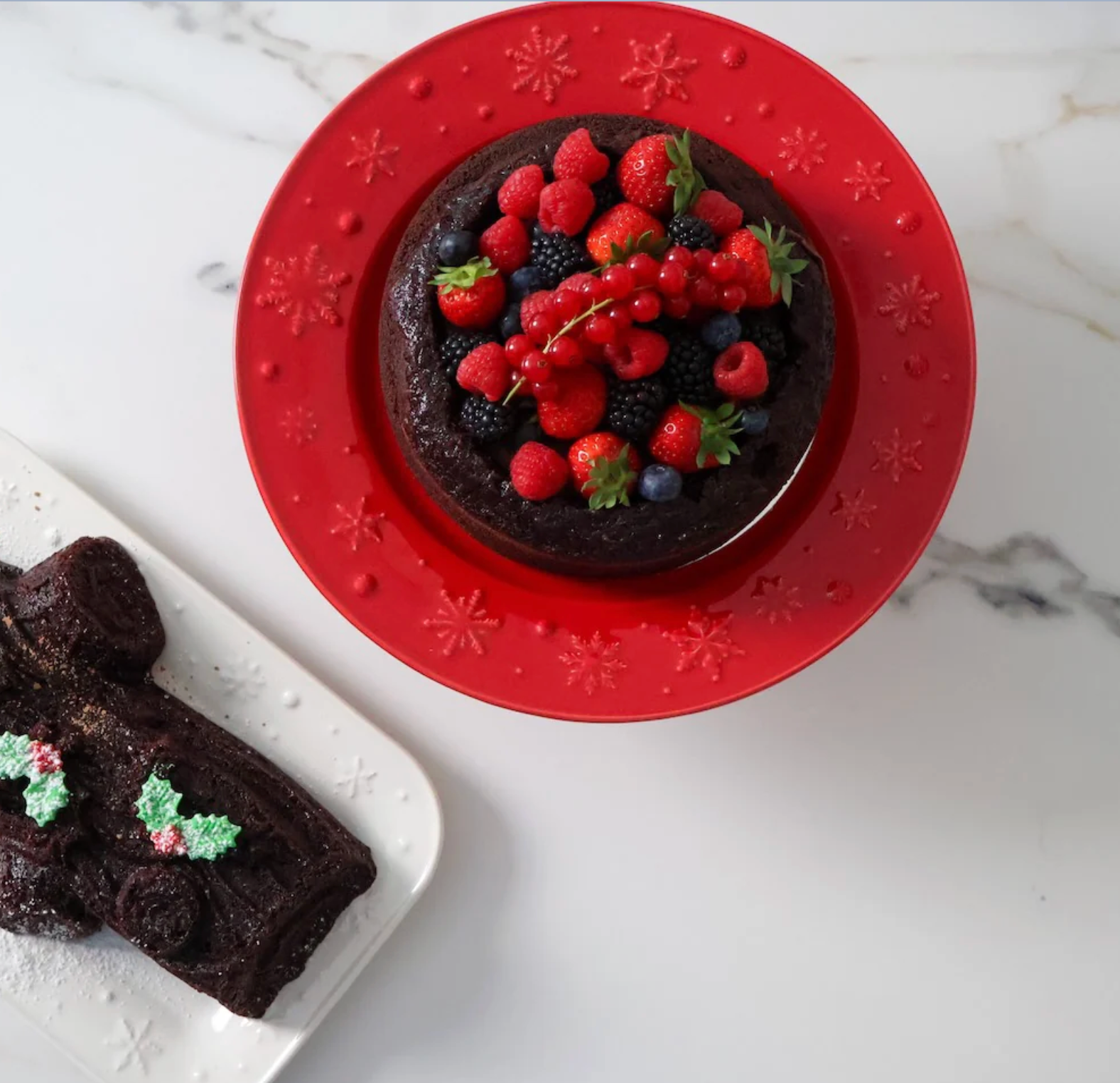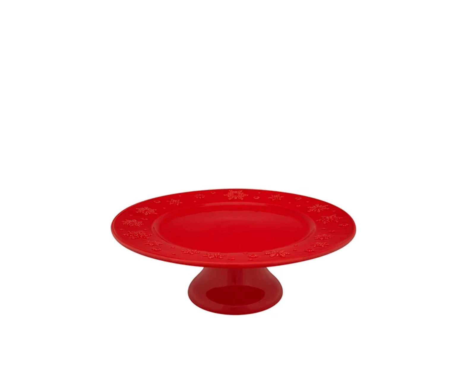 The Snowflakes Cake Stand makes a striking focal point for holiday gatherings. Its glossy red finish and elegant form are highlighted by raised snowflake detailing that captures the look of gently falling snow.